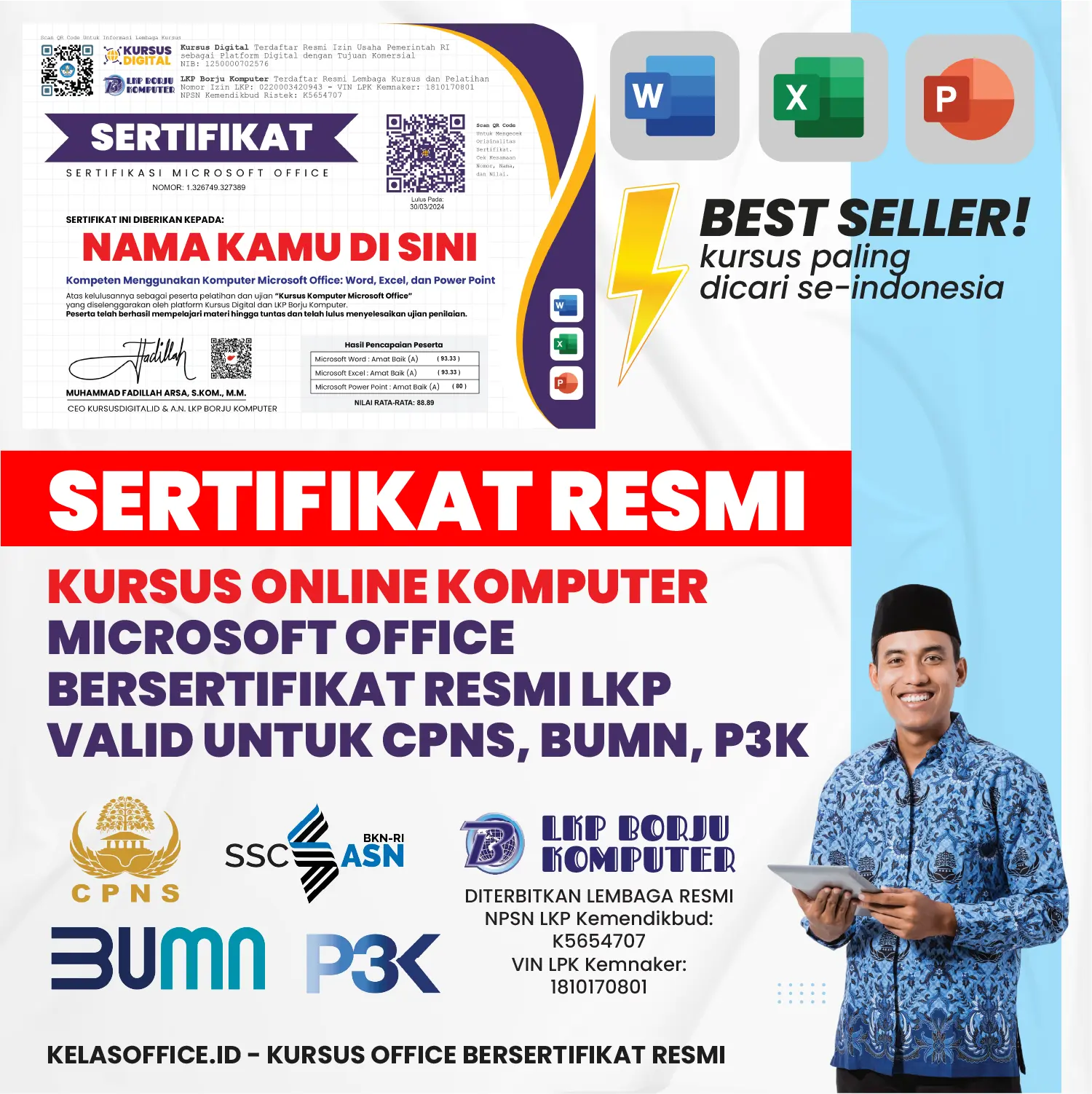 Kelas Office menyediakan kelas belajar Microsoft Office dengan sertifikat resmi dari LKP skala nasional. Bisa dipergunakan untuk keperluan setingkat nasional seperti CPNS, BUMN, PPPK, dan melamar kerja ke perusahaan.