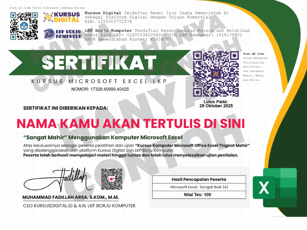Di dalam sertifikat terdapat nama peserta, ttd pengelola, hasil pencapaian, nomor NPSN Kemendikbud, nomor VIN LPK Kemnaker, dan logo LKP. Terdapat pula QR Code untuk memastikan sertifikat orisinal.